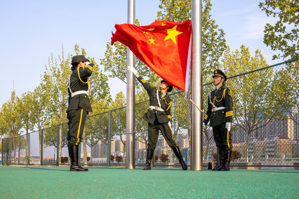 早上6点40分,迎着朝阳,国旗仪仗队昂首挺胸,迈着铿锵有力、整齐划一的步伐,护送鲜艳的五星红旗来到升旗台前。伴随着庄严的国歌,五星红旗冉冉升起,迎风飘扬。