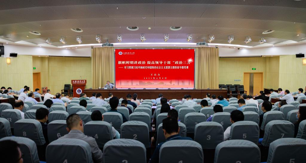 根据上级要求和学习贯彻习近平新时代中国特色社会主义思想主题教育有关安排,6月8日下午,校党委书记王自力在会议中心黄海厅,以“旗帜鲜明讲政治 提高领导干部‘政治三力’”为题讲授主题教育专题党课。在连校领导、全省第一批学习贯彻习近平新时代中国特色社会主义思想主题教育第二十五巡回指导组成员解发瑜和刘牧同志出席,全体中层干部现场聆听党课。