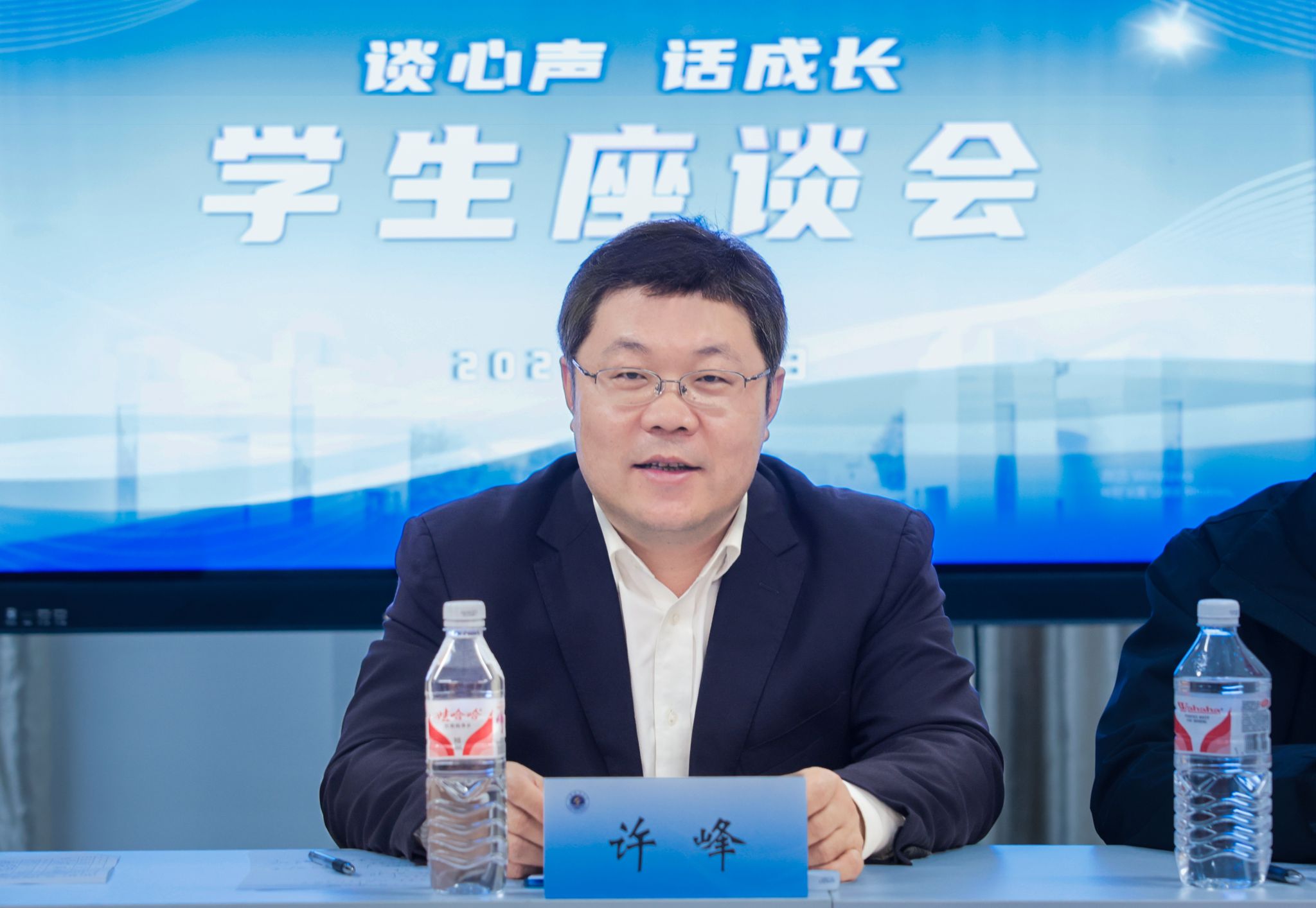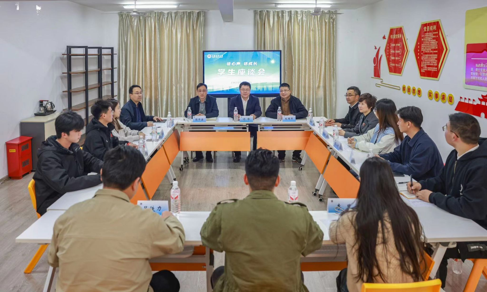 4月8日下午,我校在苍梧校区“一站式”学生社区举行“谈心声 话成长”学生座谈会。校党委书记许峰来到学生代表中间,倾听同学心声,面对面互动交流,并寄语青年学生,身在山海之间志存高远,心系江海情怀孜孜不倦,学以致用,回报国家,回馈社会。座谈会由校党委常委、副校长朱国军主持。校党委常委、组织部部长陈书法参加座谈。