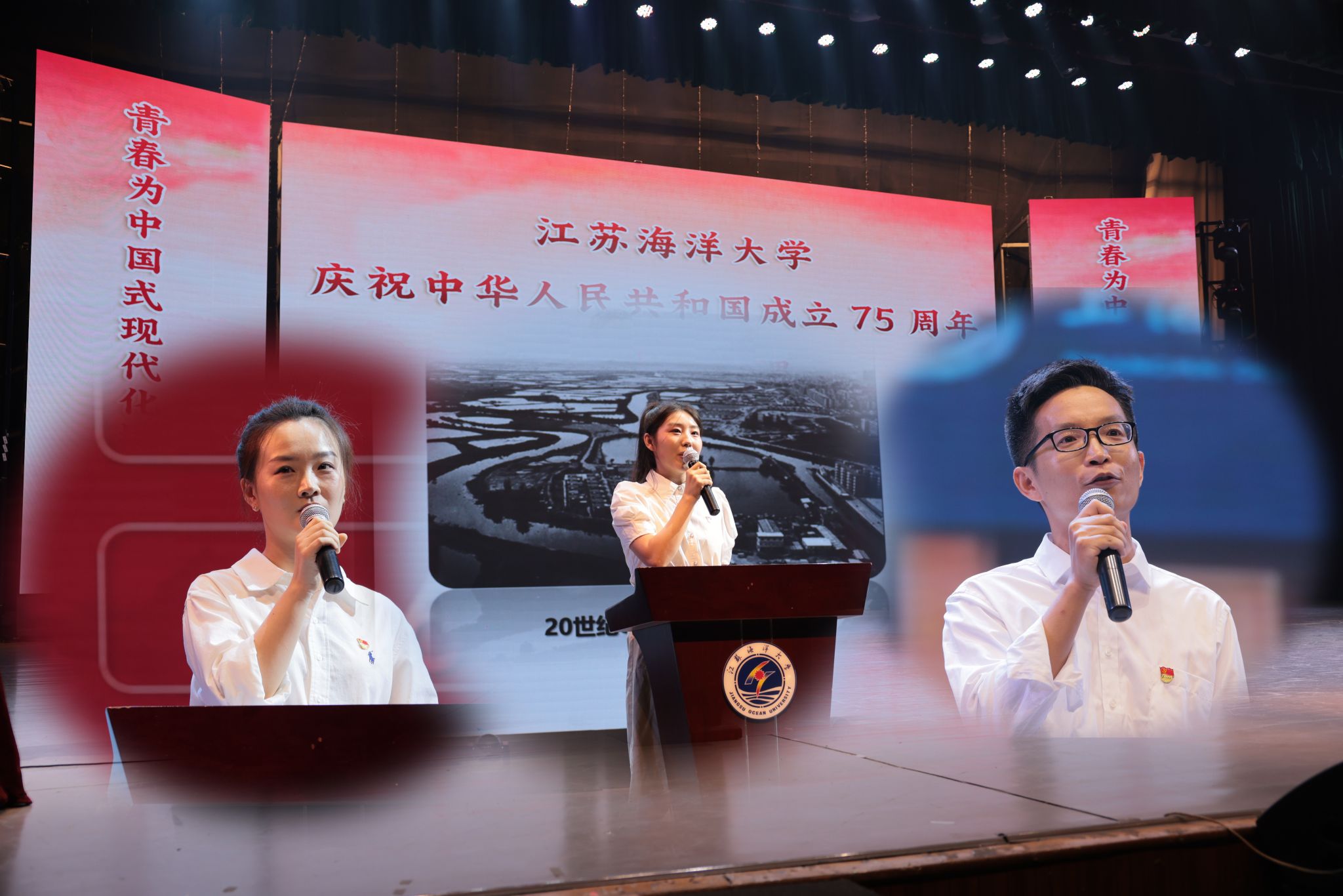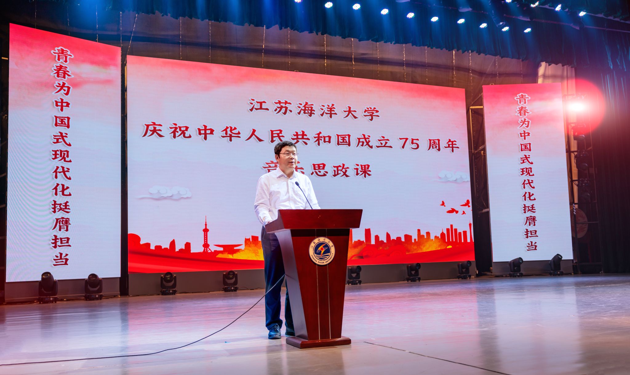 七十五载砥砺奋进,激扬青春谱写华章。9月27日晚,江苏海洋大学“庆祝中华人民共和国成立75周年音乐思政课”在苍梧校区大礼堂举行。校党委书记许峰,副校长金芙蓉、朱国军,相关部门、学院负责人,以及1400余名师生齐聚现场,同上一堂音乐思政大课,聆听经典名曲,一起感受文化艺术魅力与深厚家国情怀的交融碰撞。本次思政课以线下观看与线上直播相结合的方式进行。