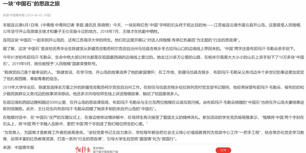 连同这块“中国石”一起来到开山岛的,还有江苏海洋大学的师生。他们在这里开展以“对话人民楷模 传承红色基因”为主题的“行走的思政课”。