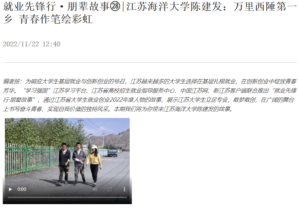 编者按:为响应大学生基层就业与创新创业的号召,江苏越来越多的大学生选择在基层扎根就业,在创新创业中绽放青春芳华。“学习强国”江苏学习平台、江苏省高校招生就业指导服务中心、中国江苏网、新江苏客户端联合推出“就业先锋行·朋辈故事”,通过江苏省大学生就业创业2022年度人物的故事,展示江苏大学生立足专业,敢梦敢创,在广阔的舞台上书写奋斗青春、实现自我价值的独特风采。本期我们将为你带来江苏海洋大学陈建发的故事。