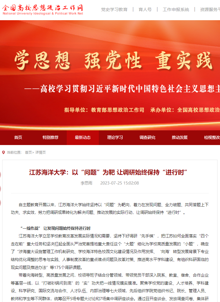 自主题教育开展以来,江苏海洋大学始终坚持以“问题”为靶向,着力在发现问题、全力破题、共同答题上下功夫、求实效,努力把调研成果转化为解决问题、推动发展的实际行动,让调研始终保持“进行时”。