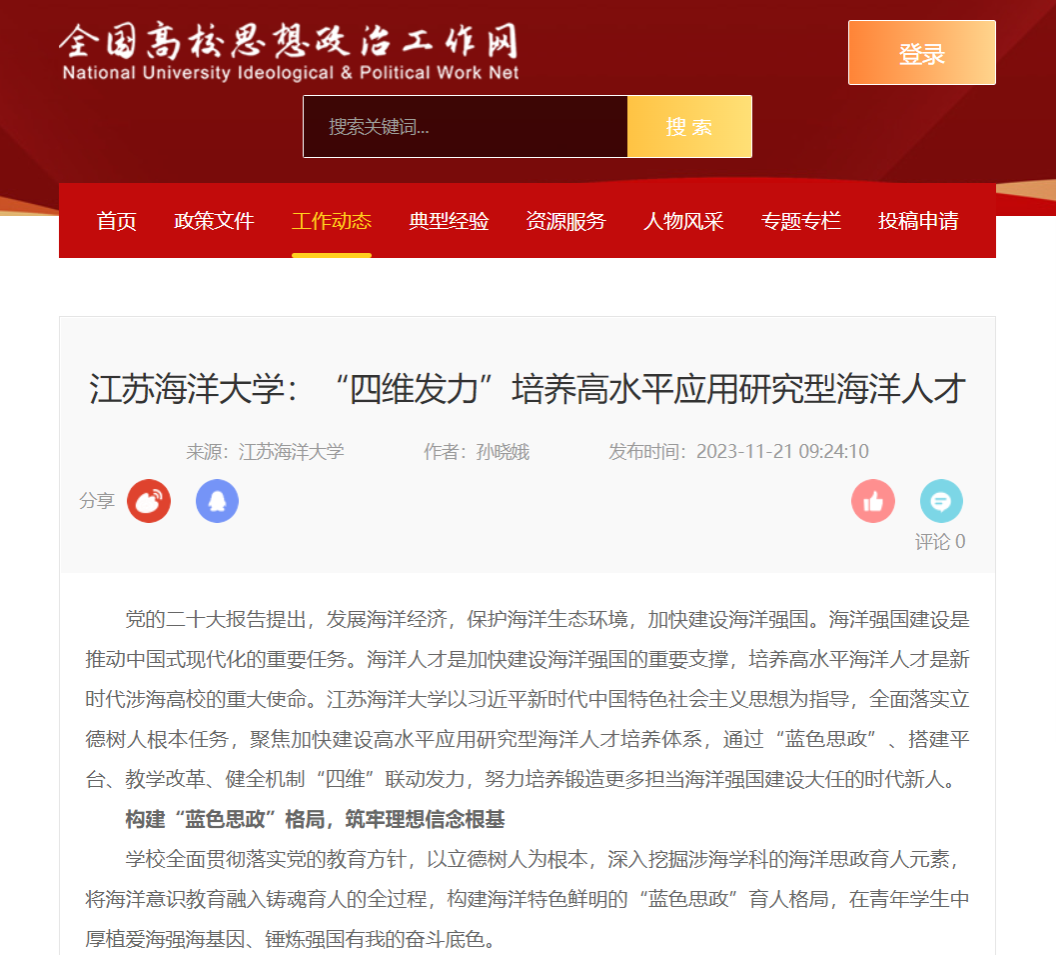 打造“蓝色思政”品牌活动,思政育人“海味”浓厚。利用世界海洋日、中国海洋宣传日等重大纪念日,邀请“蛟龙号”总指挥、中国航母女舵手、贝壳先生来校讲思政课,组织涉海专业青年博士结合研究方向讲述“信仰公开课”;通过“与党委书记面对面”“宁校有约”“开学第一课”等品牌活动,校党委书记、校长与青年学生面对面谈“铭记历史 筑梦海洋”“知海爱海 强海有我”;组织学生走进临海企业、渔业基地参加海洋经济文化调研、海洋科技研究、海洋生态保护等主题实践活动……通过一次次沉浸式、研讨式的“蓝色思政课”,在理论与实践素养提升中,青年学生铸造了一颗颗爱党报国的“海洋魂”。2016届毕业生王海洋获评“2020年全国大学生就业创业年度新闻人物”、2021年全国“最美基层高校毕业生”。2019届毕业生陈建发获评“2022年江苏省大学生就业创业年度人物”。