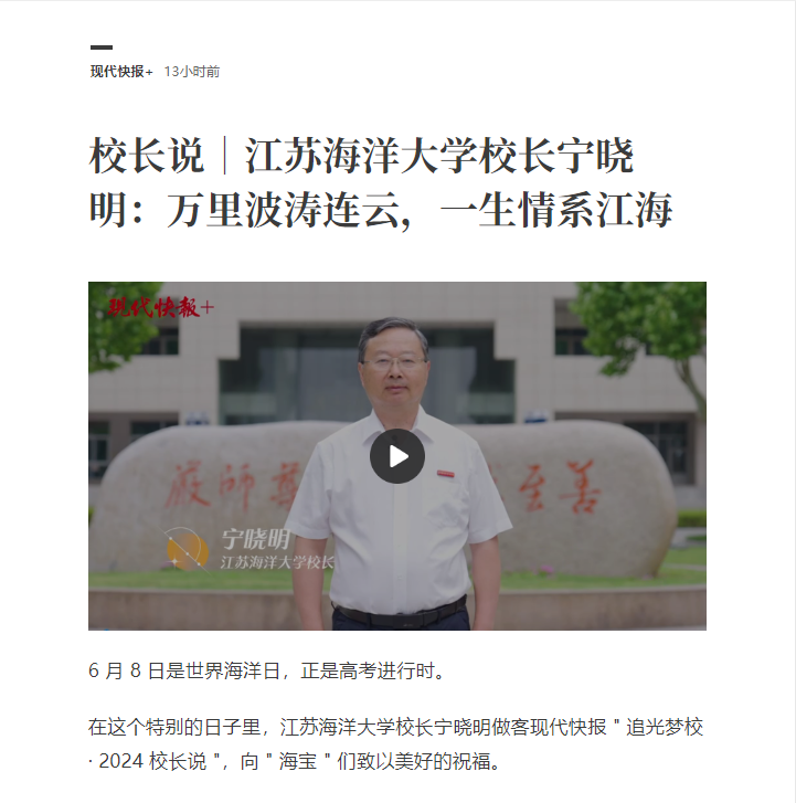 在这个特别的日子里,江苏海洋大学校长宁晓明做客现代快报" 追光梦校 · 2024 校长说 ",向 " 海宝 " 们致以美好的祝福。