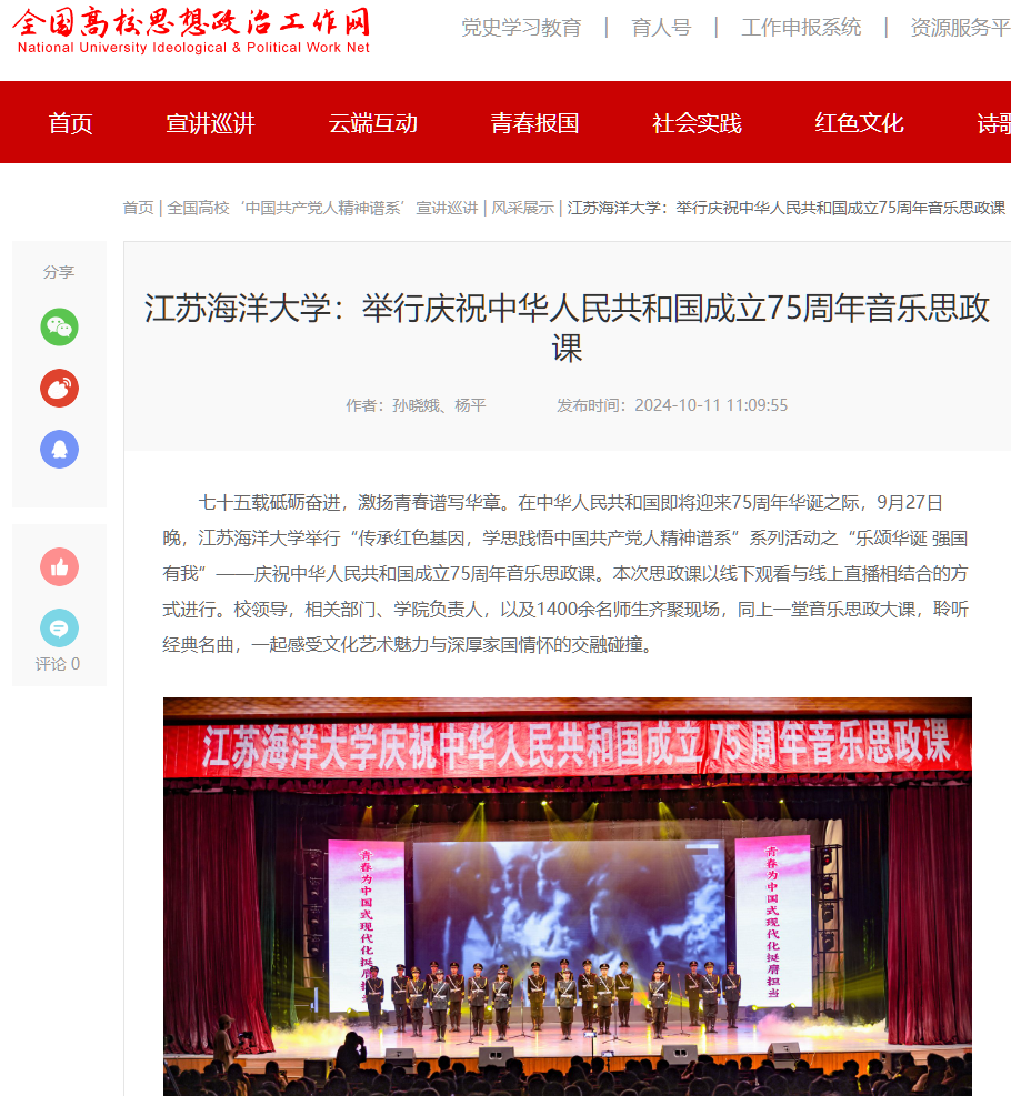 75年来,中国走过了辉煌的历程,取得了举世瞩目的成就,这其中也创作了一大批传播中国共产党人坚定理想信念与崇高情怀的红色音乐。本次音乐思政课是江苏海洋大学庆祝中华人民共和国成立75周年的重要活动之一,也是学校思政课铸魂育人的创新实践。
